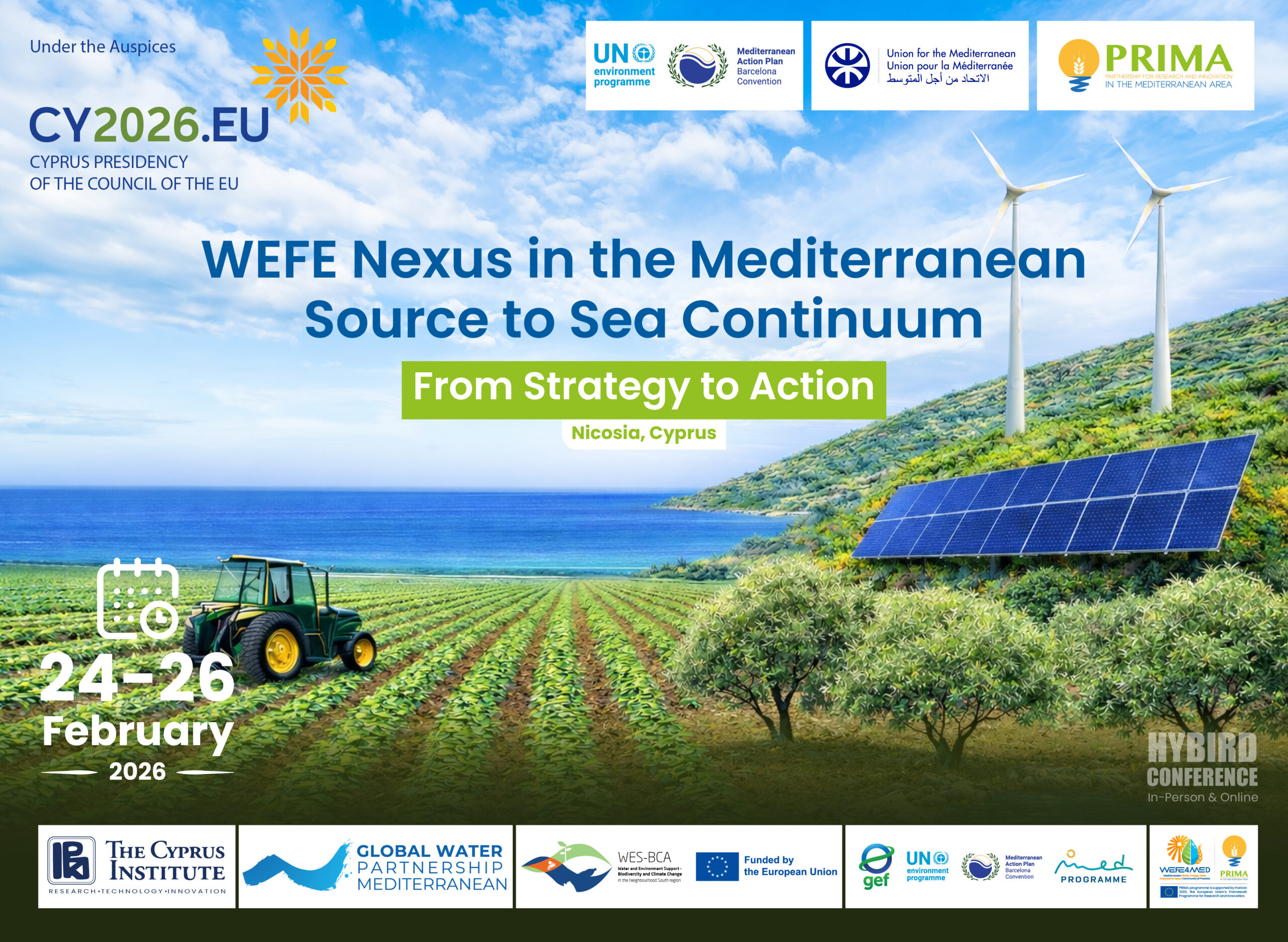 The conference will take place 24–26 February 2026 in Nicosia, Cyprus, and online. It will be held under the auspices of the 2026 Cyprus Presidency of the EU, within the frameworks of UNEP MAP, UfM, and PRIMA, and with the support of the GEF UNEP MAP MedProgramme and the PRIMA WEFE4MED Project.