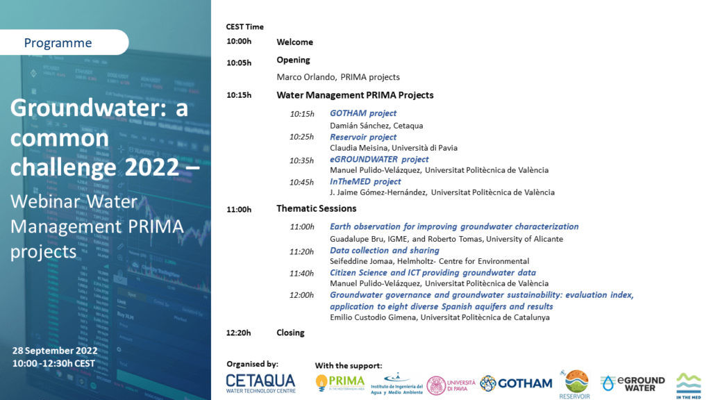 The first two sessions of the webinar will feature a series of presentations by the partners of the three projects, while the last session will be a roundtable discussion featuring water experts from the Institut Méditerranéen de l’Eau (IME), Irrigants Europe, the Food and Agriculture Organization of the United Nations (FAO), the Joint Research Centre (JRC) of the European Commission and the Arizona State University.