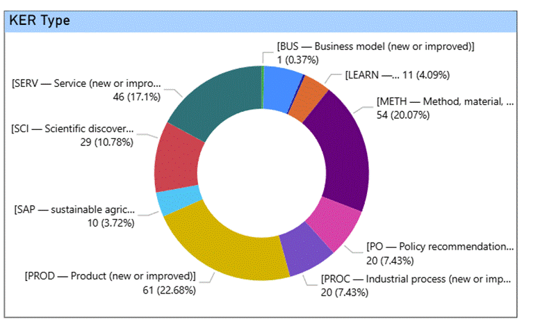 Based on this first analysis, PRIMA findings show that KERs take different forms. About half are tangible outputs: products (22.7%), methods and tools (20.1%), industrial processes (7.4%), and agricultural practices (3.7%). The other half consists of non-tangible outputs like services (17.1%), scientific discoveries (10.8%), policy recommendations (7.4%), and learning tools (4.1%).