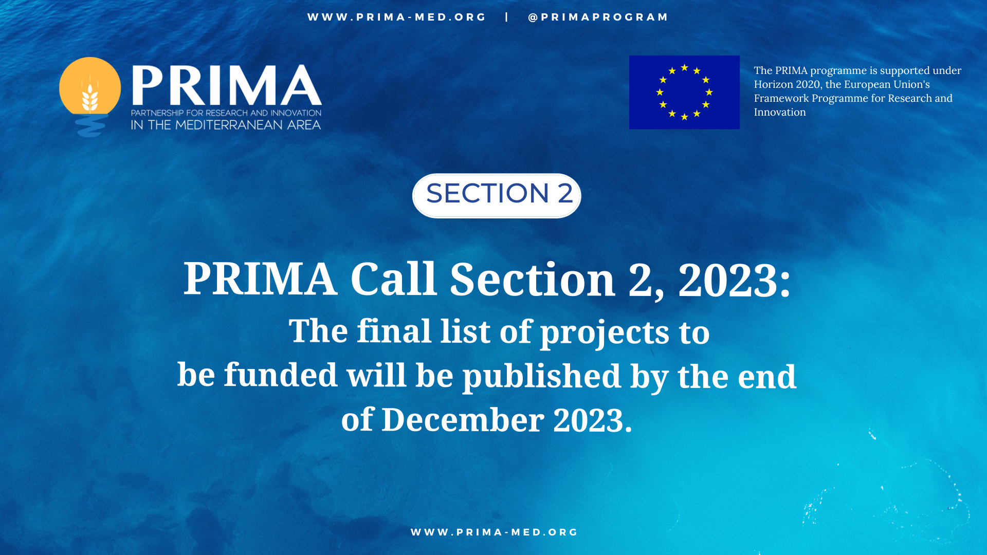 The scientific evaluations of the proposals submitted to PRIMA 2023 Section 2 Calls have been finalised and a list of 27 proposals have been identified as eligible for funding or ‘under condition’ to be funded.