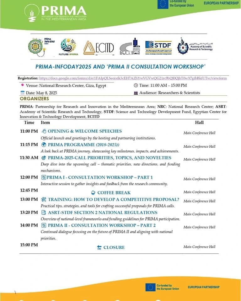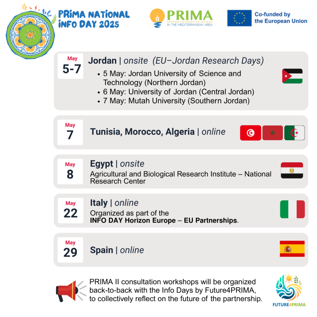 In several countries, the National Info Days will be followed by consultation workshops under the FUTURE4PRIMA project. These workshops aim to gather direct input from the PRIMA community to help shape the next phase of the partnership. Topics include: